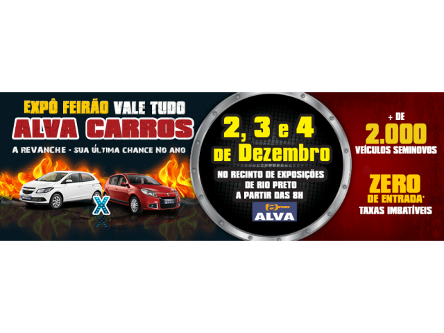 Começa na próxima sexta-feira (02/12) o EXPÔ FEIRÃO VALE TUDO ALVA CARROS - A REVANCHE. É o último Feirão do Ano, os melhores seminovos de toda a região em um só lugar com taxas imbatíveis e aprovação de crédito na hora. É de 2 a 4 de dezembro no Recinto de Exposições de Rio Preto. Vai encarar ou continuar a pé